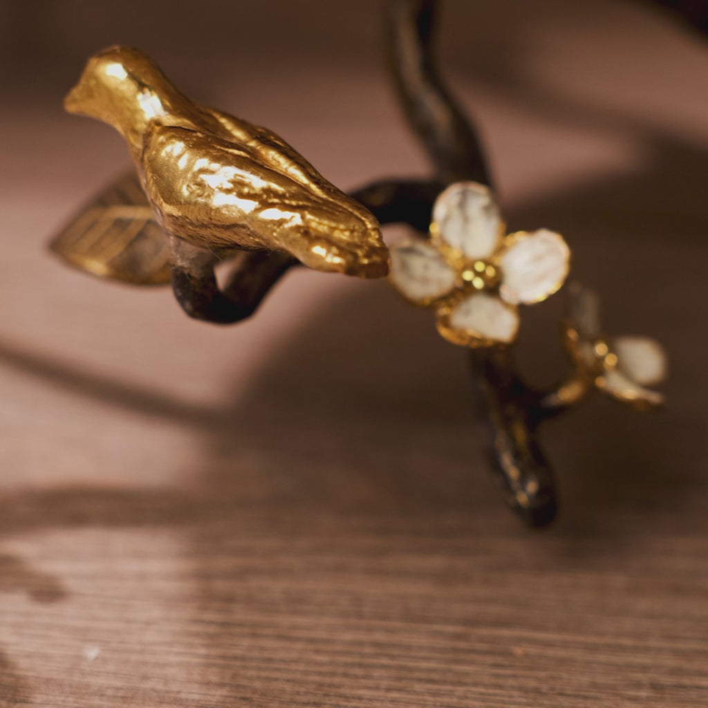 The Lovebirds Cake Stand with Dome is hand forged with delicate lovebirds on a Tree of Life-inspired branch, accented with white four-petaled flowers symbolizing unity and innocence.